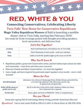 Red, White, & You + Add to Google Calendar + iCal / Outlook export 00 days 00 hours 00 minutes 00 seconds Date Apr 15 2026 Time 6:00 PM - 8:00 PM Cost $5.00 Location Rock Creek Restaurant 200 Addison Ave. W., Twin Falls, ID Category Partner Liberty Group Meetup Organizer Magic Valley Republican Women of Buhl Share this event